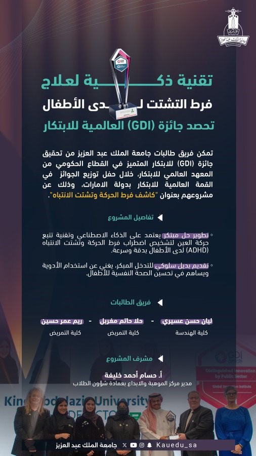 حصد فريق من طالبات جامعة الملك عبد العزيز جائزة (GDI) العالمية للابتكار في القطاع الحكومي بمعهد الابتكار العالمي بدولة الإمارات، عن مشروعهن المبتكر “كشف فرط الحركة وتشتت الانتباه”، الذي يعتمد على الذكاء الاصطناعي لتشخيص اضطراب ADHD لدى الأطفال. نهنئ طالباتنا على هذا التميز.